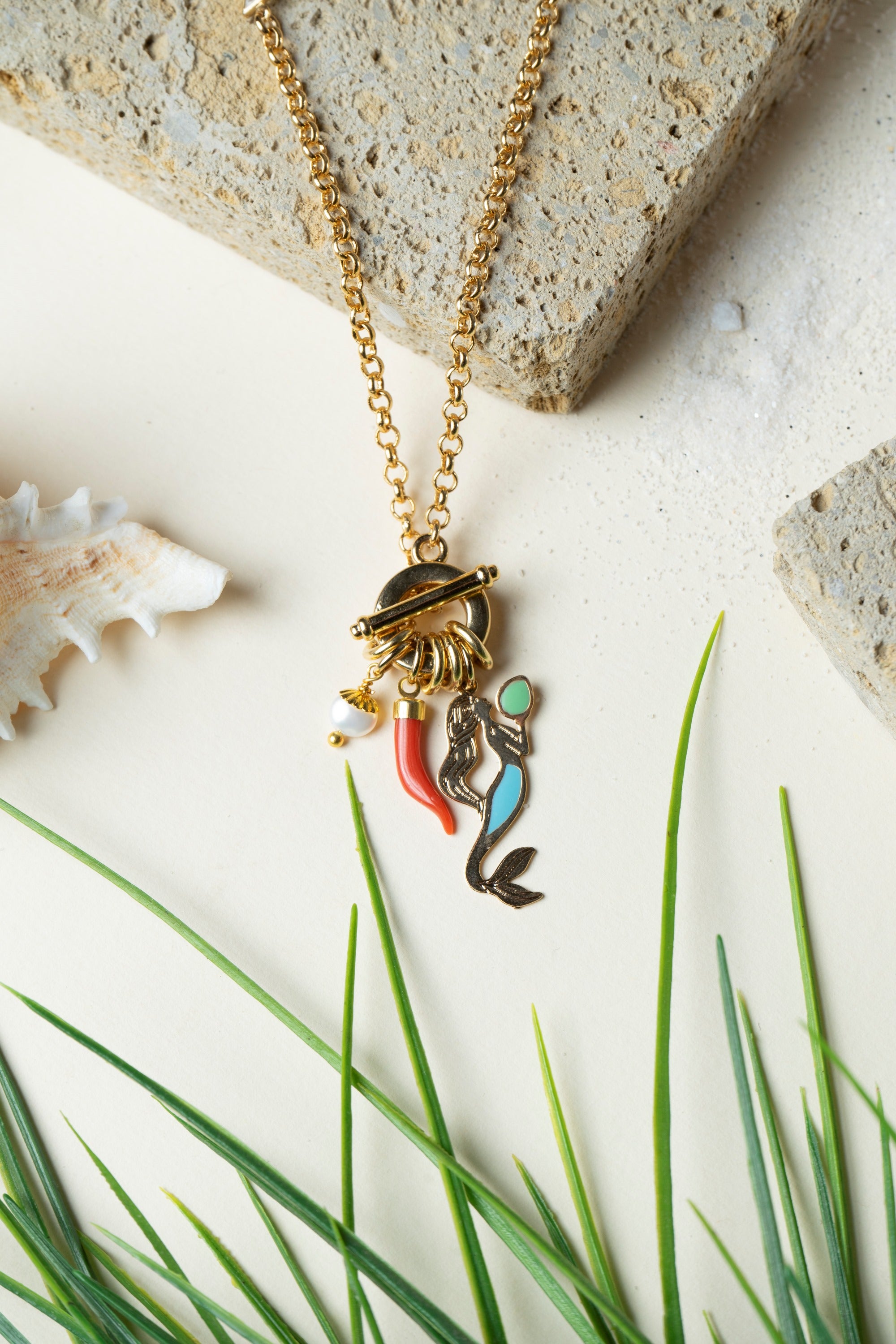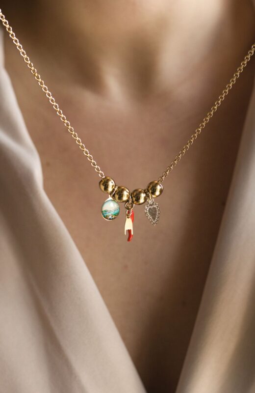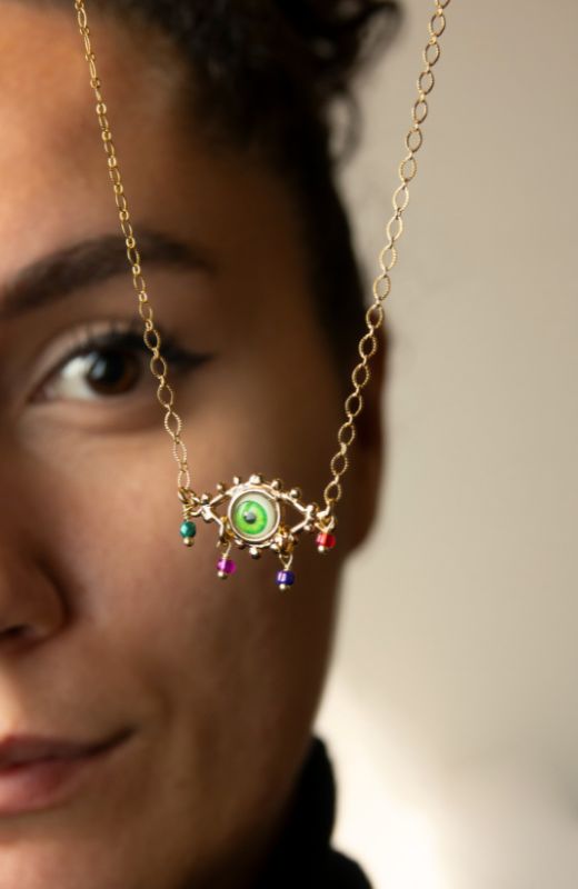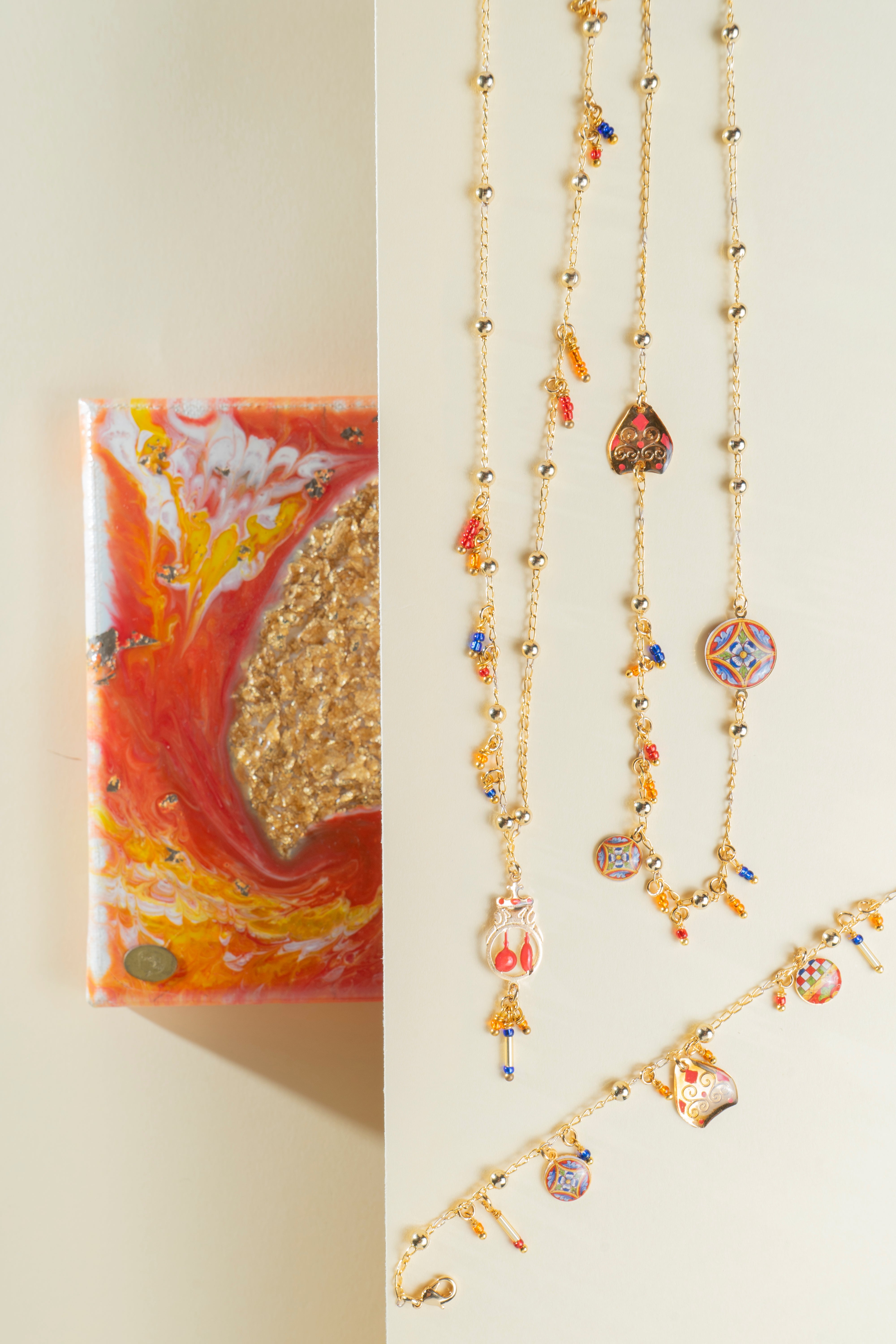 The long necklace has a tambourine that acts as guardian of the hand-cast resin. The ace is protected by a cast of t... -