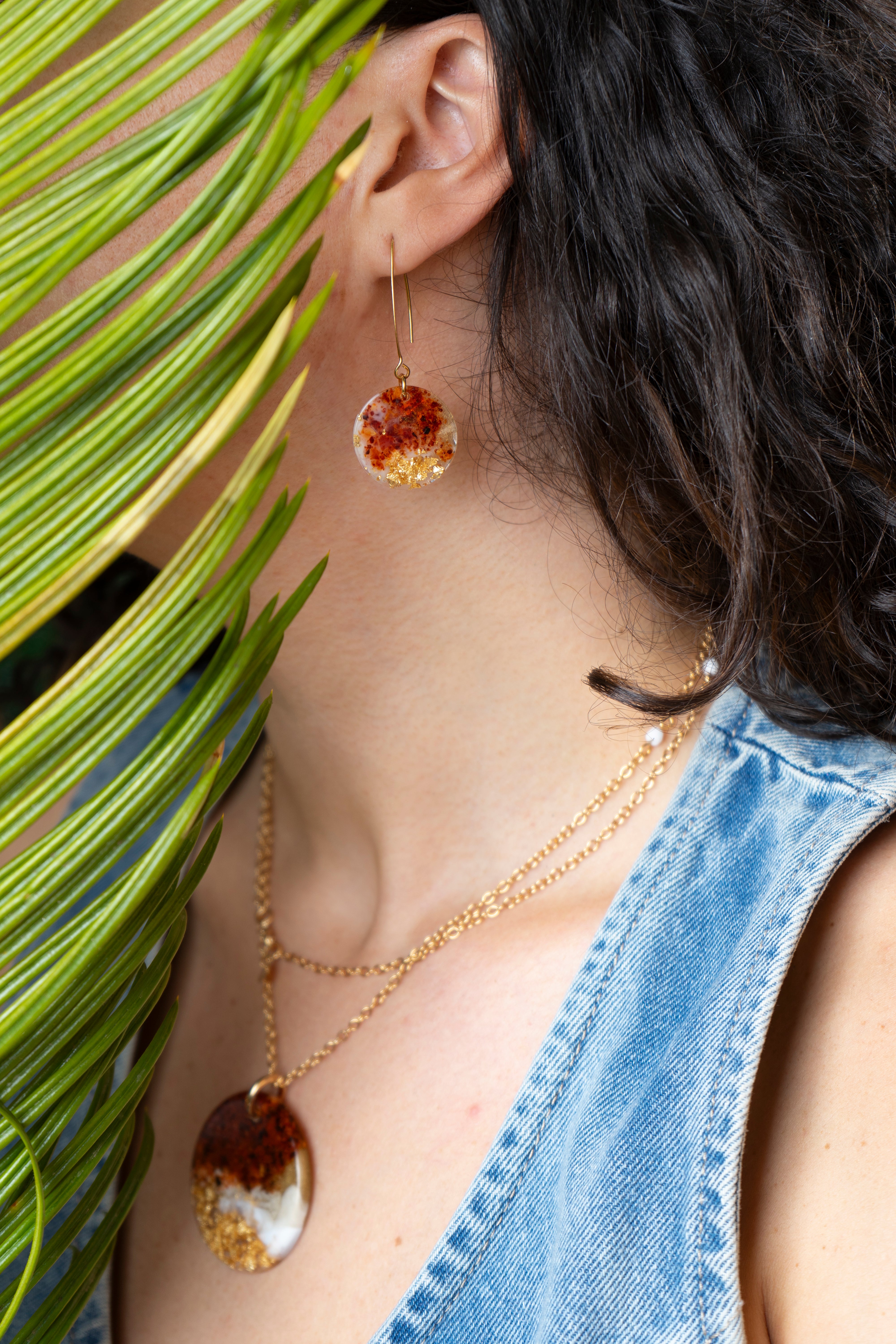 The necklace is made by hand pouring the resin into a mold, including ground coffee , pigment and 18Kt gold leaf. The... -