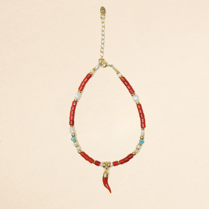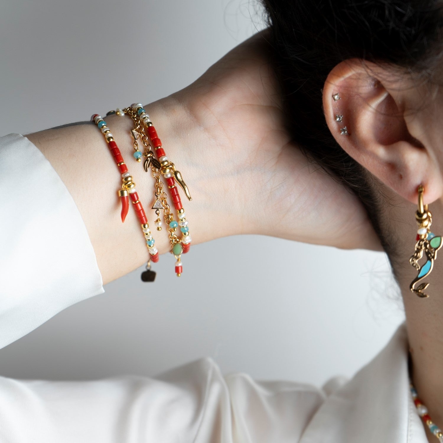 Il bracciale infilato della collezione Partenope in rosso è ispirato alla leggenda della sirena Partenope. Secondo la leggenda, il grande poeta Virgilio raccolse un uovo magico e incantato che fu poi custodito in una caraffa d'acqua nel Castello dell'Ovo. Questo bracciale rappresenta la magia e la bellezza di Partenope, perfetto per chi ama il fascino del mare.