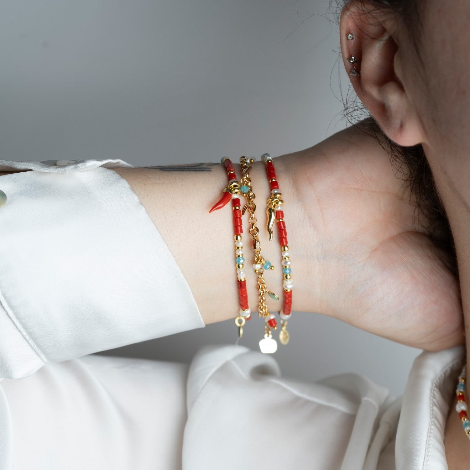 Il Bracciale Multicharms della Collezione Partenope in Rosso è ispirato alla leggenda della sirena Partenope e dell'uovo magico raccolto dal grande poeta Publio Virgilio Marone. Con charms e perle, questo bracciale porta con sé la magia e l'incanto di Megaride, e sarà una preziosa aggiunta al tuo stile.