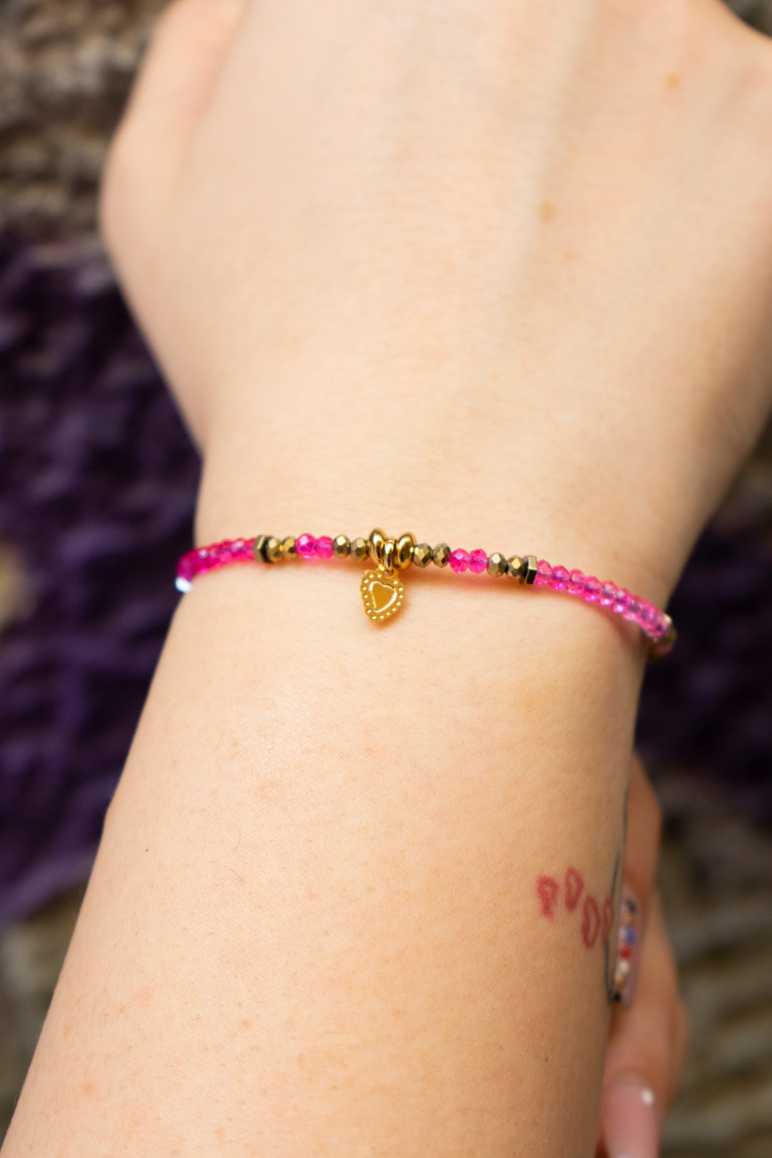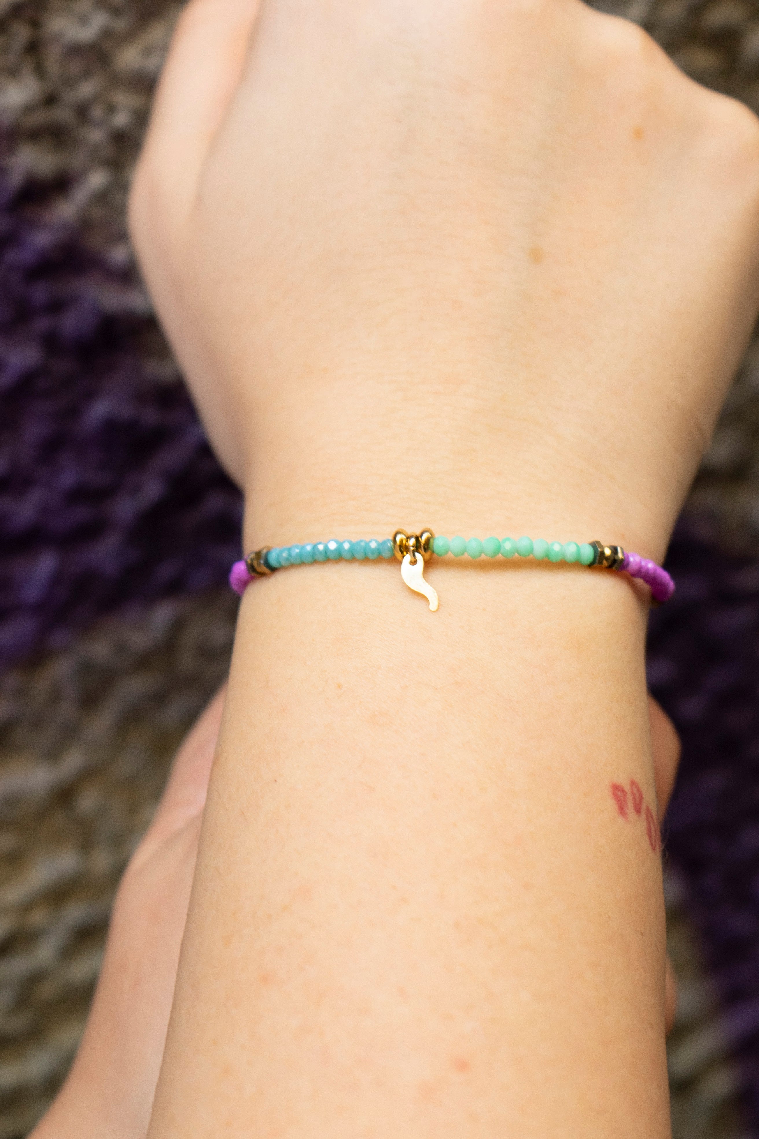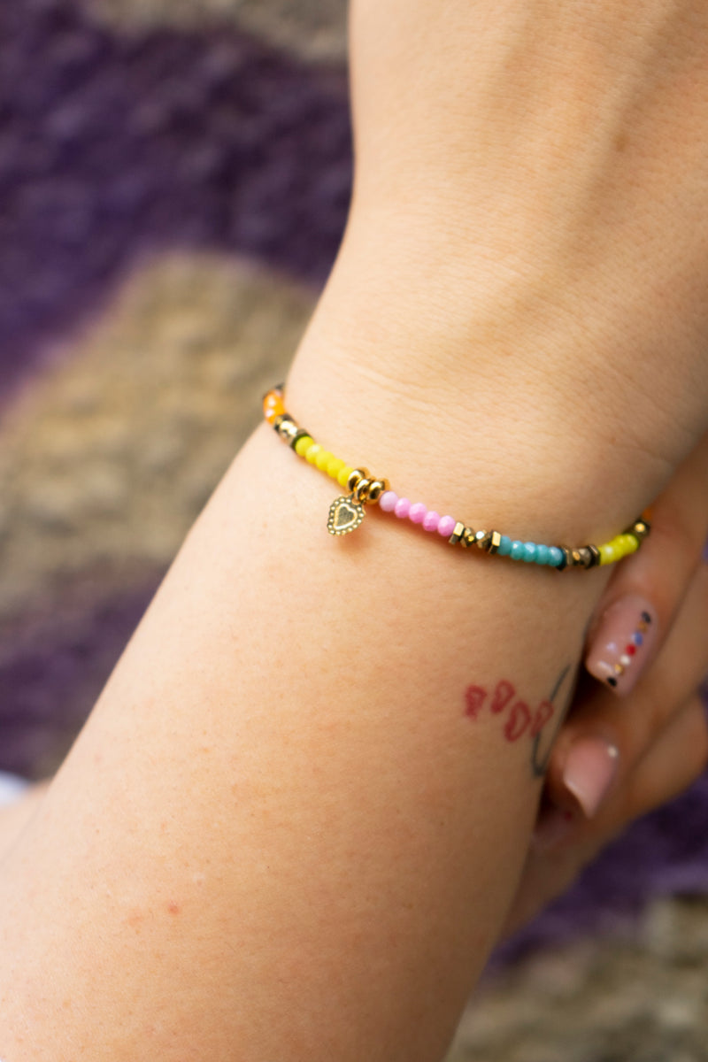 Bracciale realizzato con filo d'acciaio e componenti in ottone galvanizzato oro, pensato per dare un tocco di colore e carattere ai tuoi look estivi. Super colorato, leggero e perfetto per la bella stagione (ma da tenere lontana da acqua, profumi e doccia!).