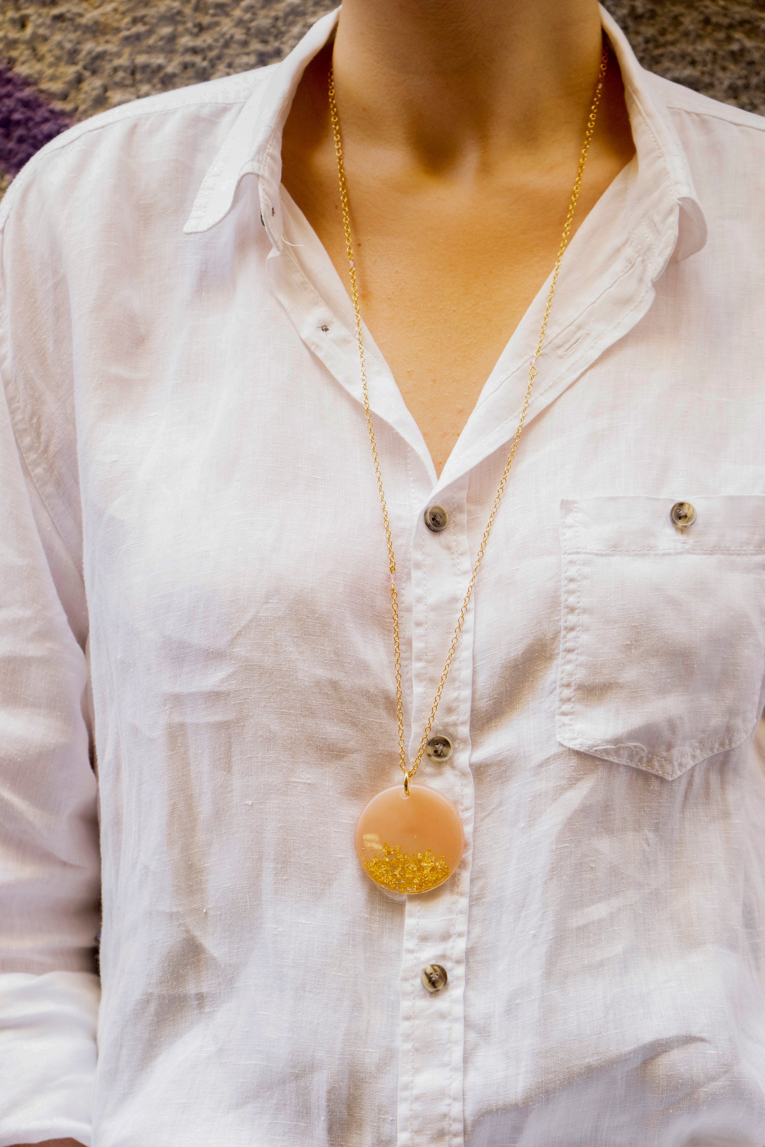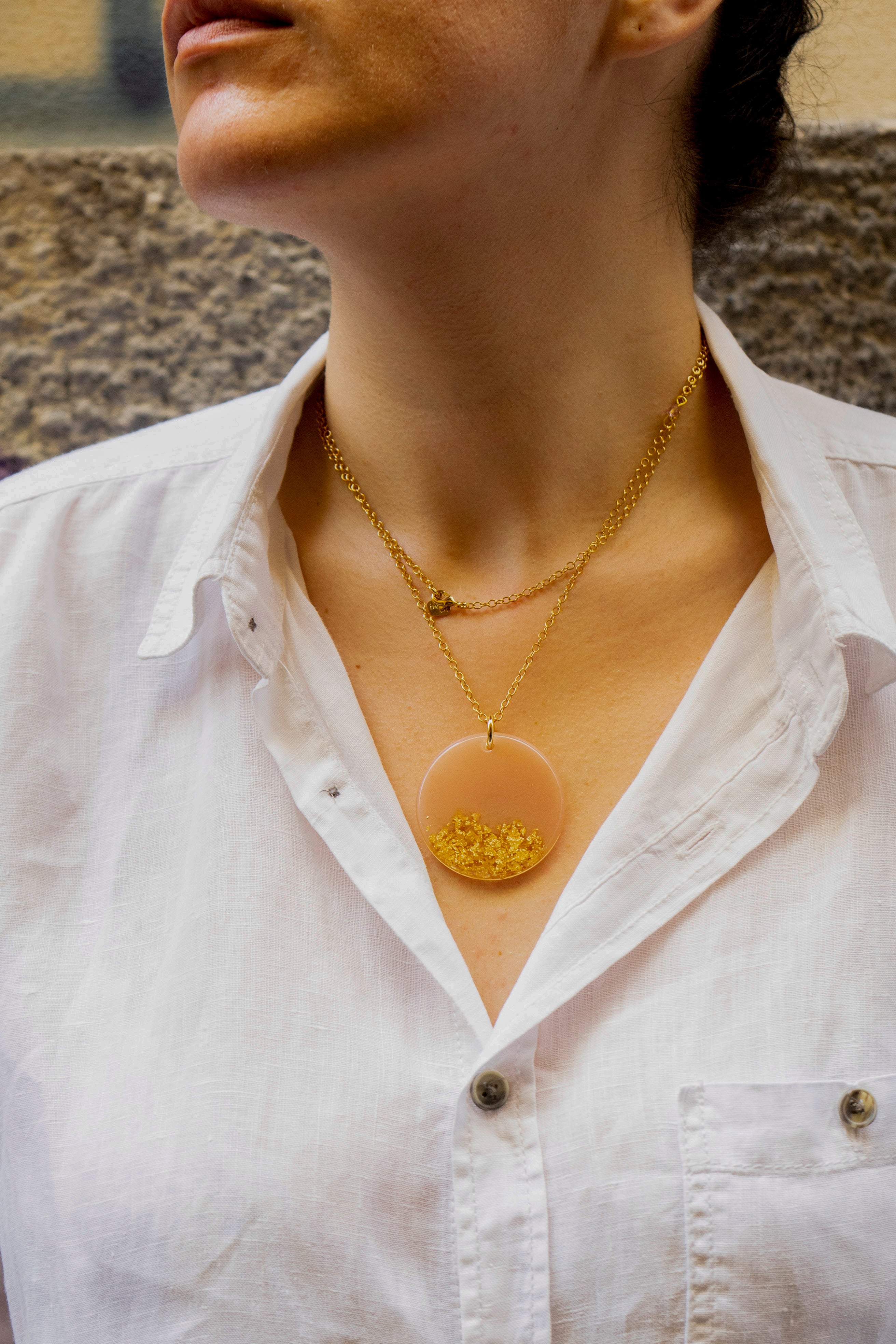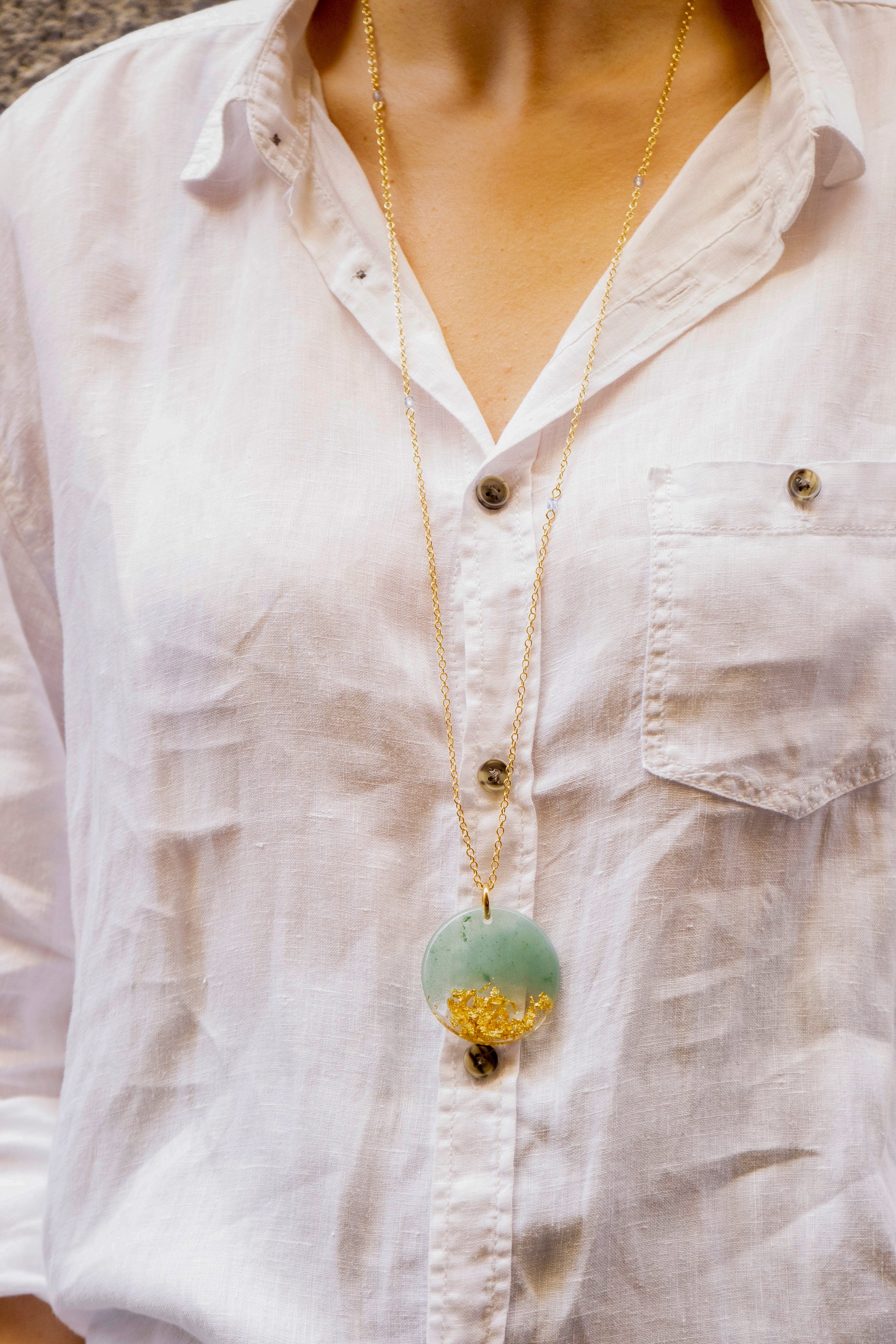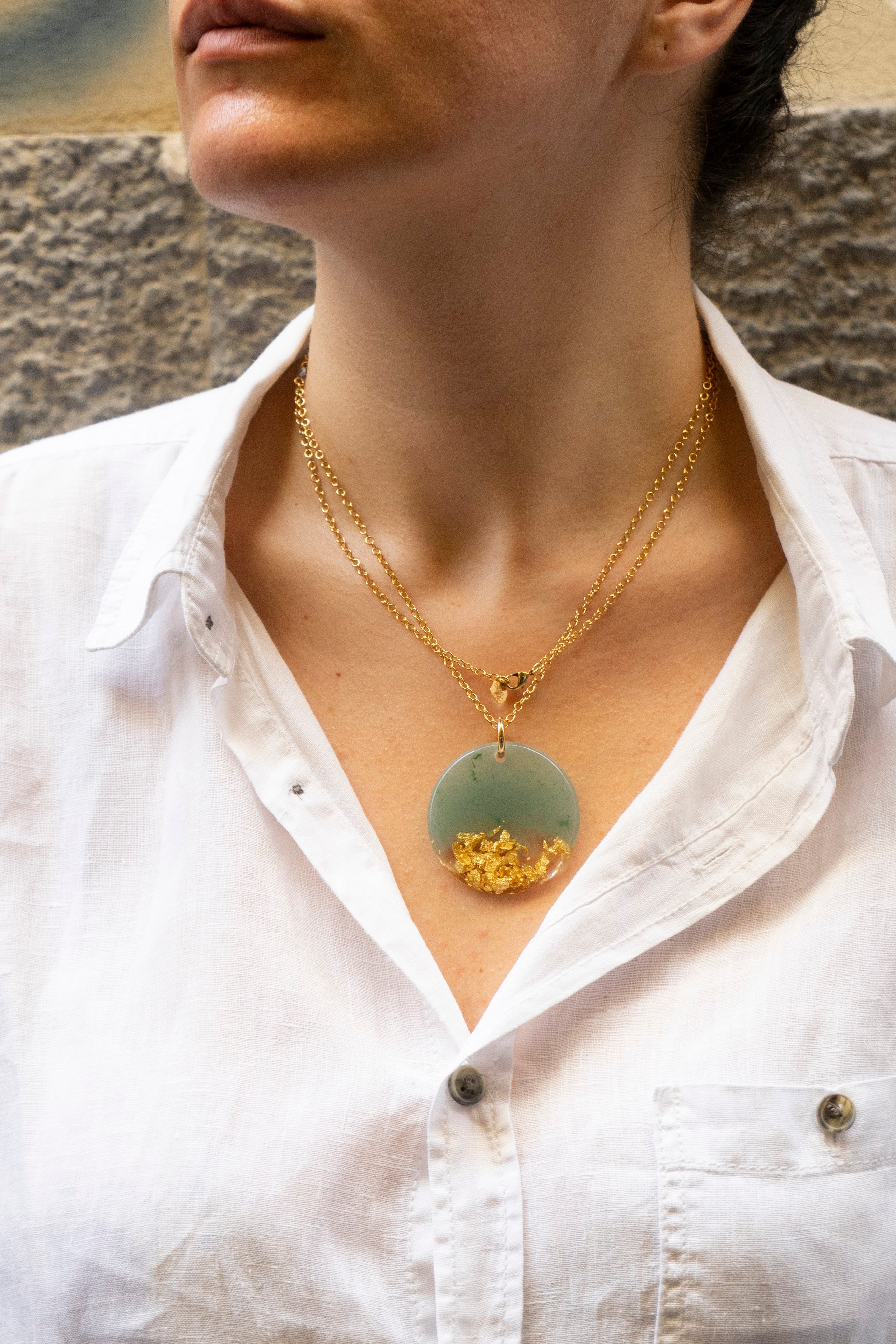 The necklace is made by hand casting the resin into a mold, including pigment and 18Kt gold leaf.