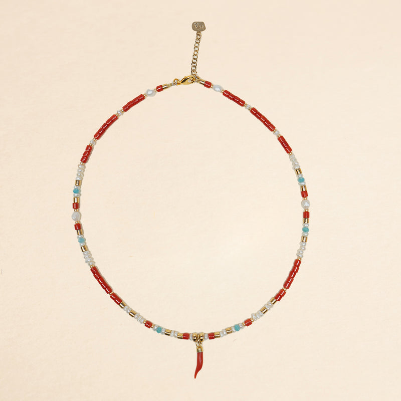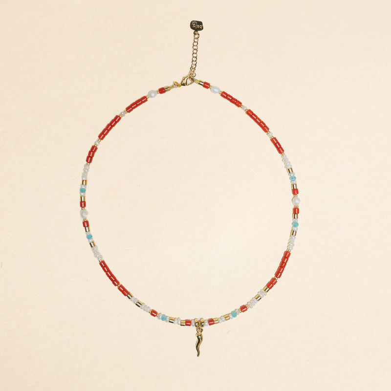 La collana infilata in ottone fa parte della collezione Partenope in rosso. Ispirata alla leggenda della sirena Partenope, racconta di un uovo magico raccolto dal grande poeta e mago Publio Virgilio Marone che fu custodito nel Castello dell'Ovo. Indossa questa collana per portare con te il fascino e la magia della leggenda di Partenope.