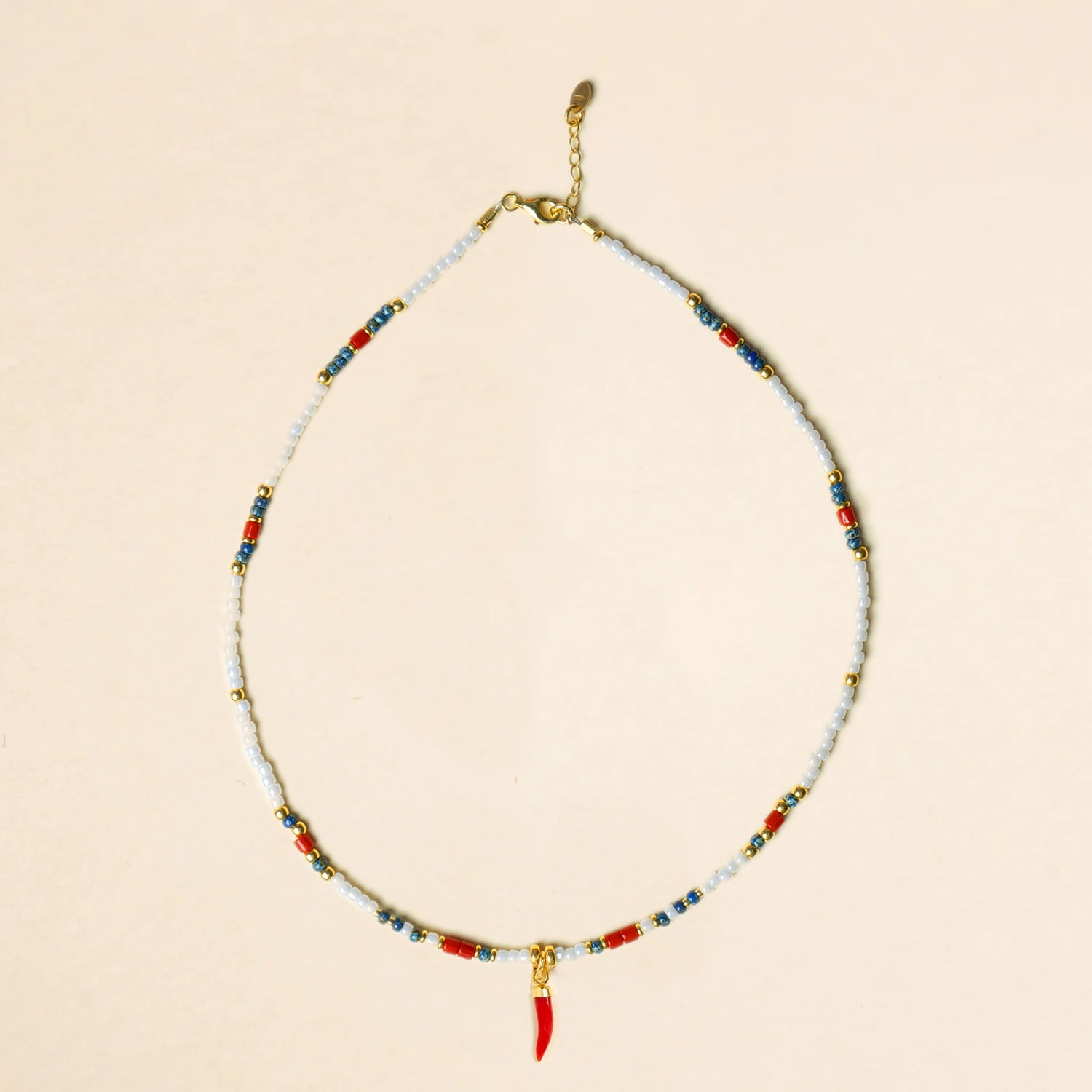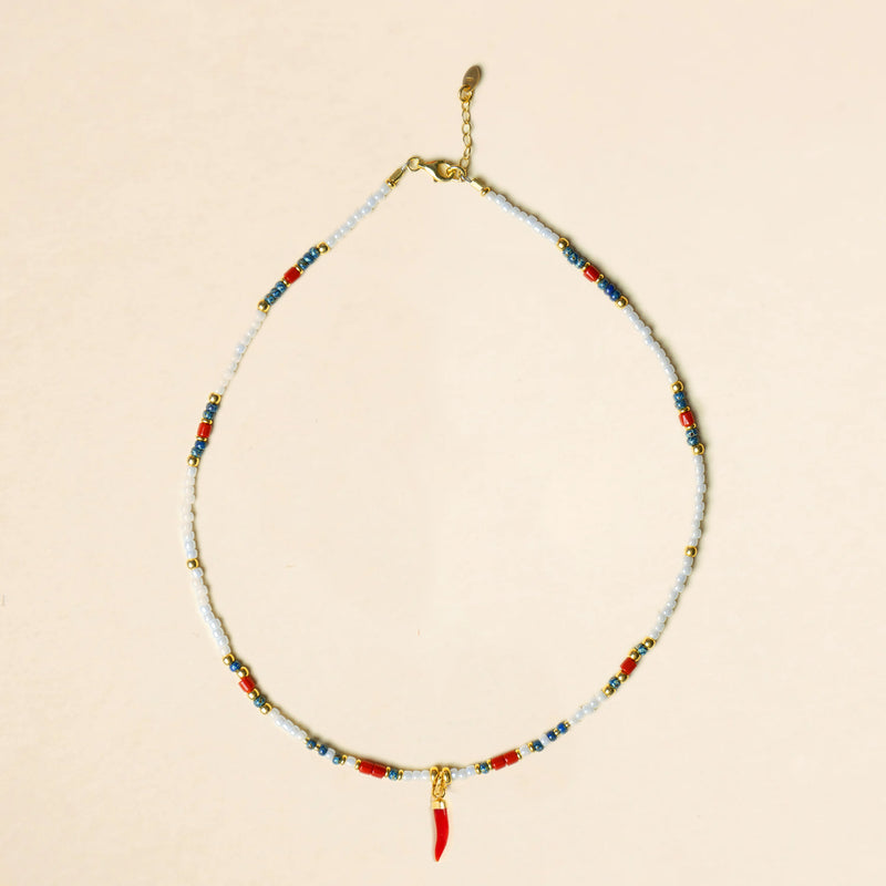 The beaded necklace is made with steel wire and a lot of patience, threading Miyuki stones and coral.