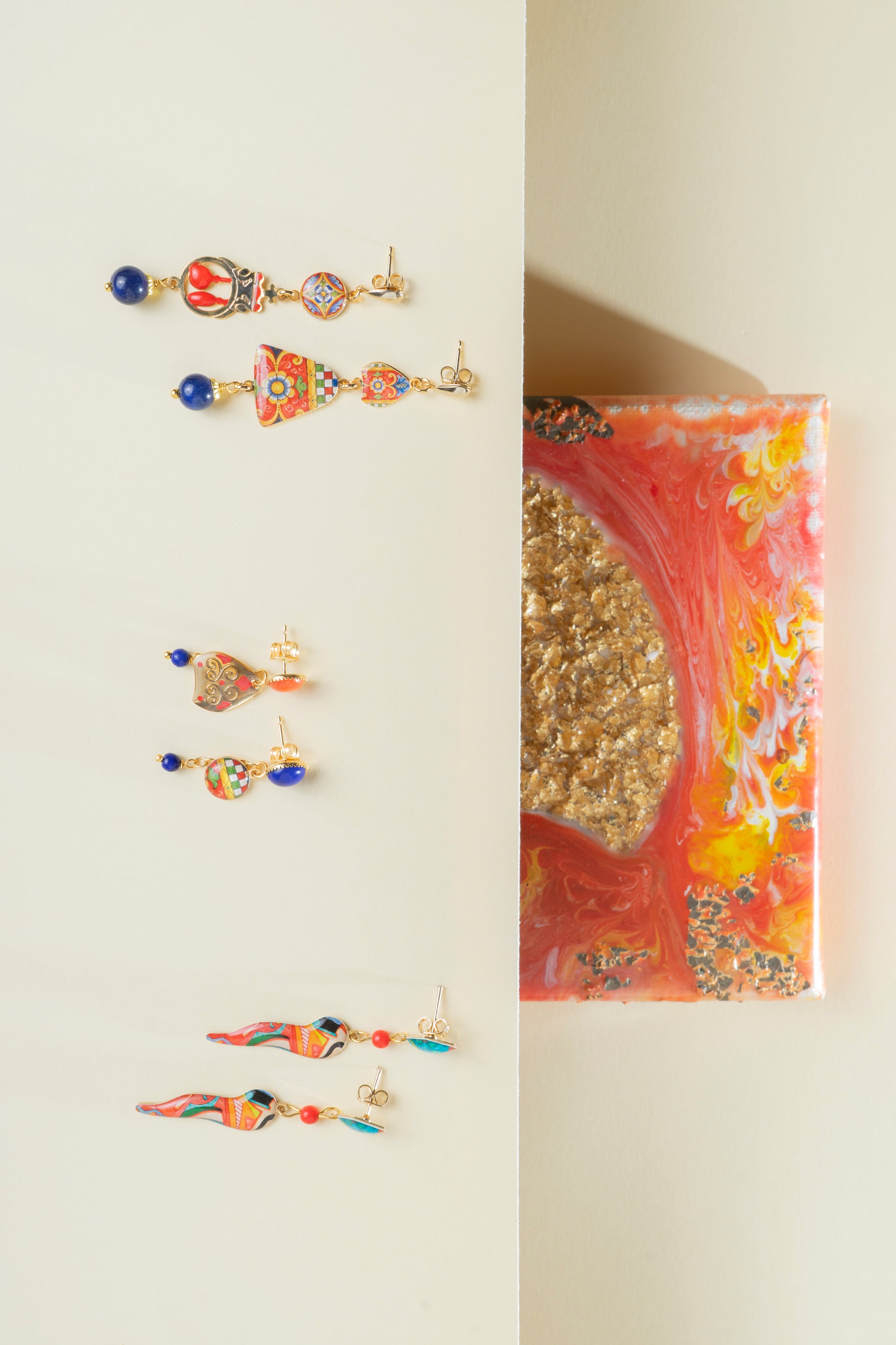 Senti il brivido dell'avventura con gli Orecchini Ampolla - Collezione Januarius! Celebra il coraggio di San Gennaro, protettore di Napoli, con un prezioso gioiello artigianale. La mitra del vescovo e le riggiole colorate simboleggiano l'unione tra cielo e terra. Esplora la tradizione e il miracolo della liquefazione del sangue, lasciandoti stupefare dall'enigma!