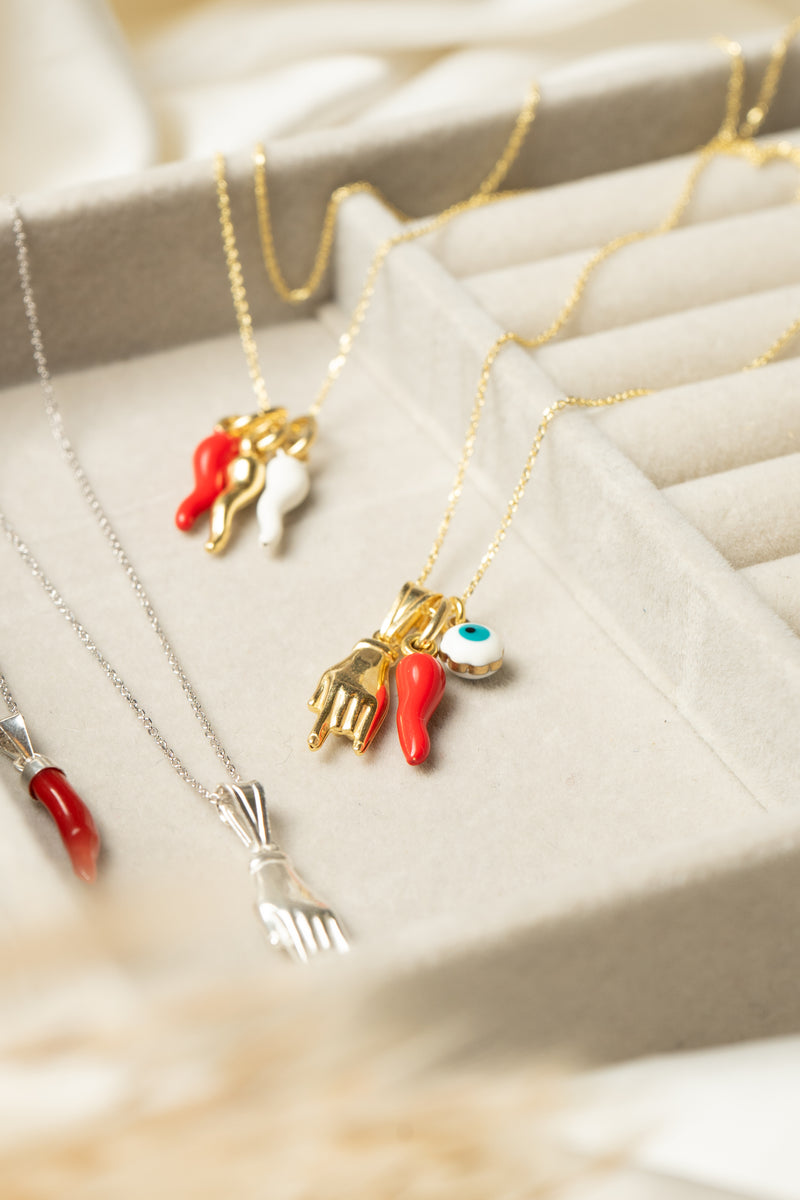 La parola ”Ciorta” ,in napoletano, significa ”Fortuna” e questa collana racchiude i simboli della nostra città: il famoso corno rosso napoletano, le corna sempre rivolte verso il basso e l’occhio di Santa Lucia.