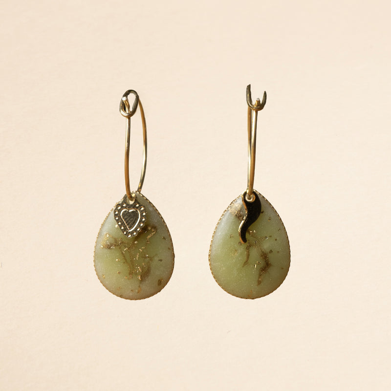 Ogni orecchino Marble Goccina Verde è un capolavoro artigianale: il cerchietto in argento 925 modellato a mano accoglie una goccia in ottone galvanizzato oro, dove la resina sapientemente colorata incontra la foglia oro creando sfumature uniche e irreplicabili.